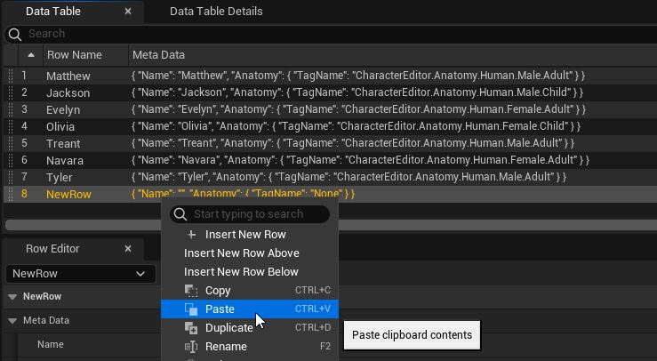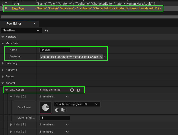 For this tutorial, we use DT_PresetCustomizationProfiles_V11 (figure below) that is assigned to BP_Character ➝ Preset Data Table and passed to BP_CharacterCustomization ➝ Preset Data Table by BP_Character ➝ Construction Script.