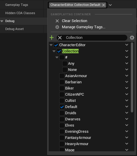 The gameplay tag CharacterEditor.Collection.# and its children are special filters and not meant to be assigned to CDAs.